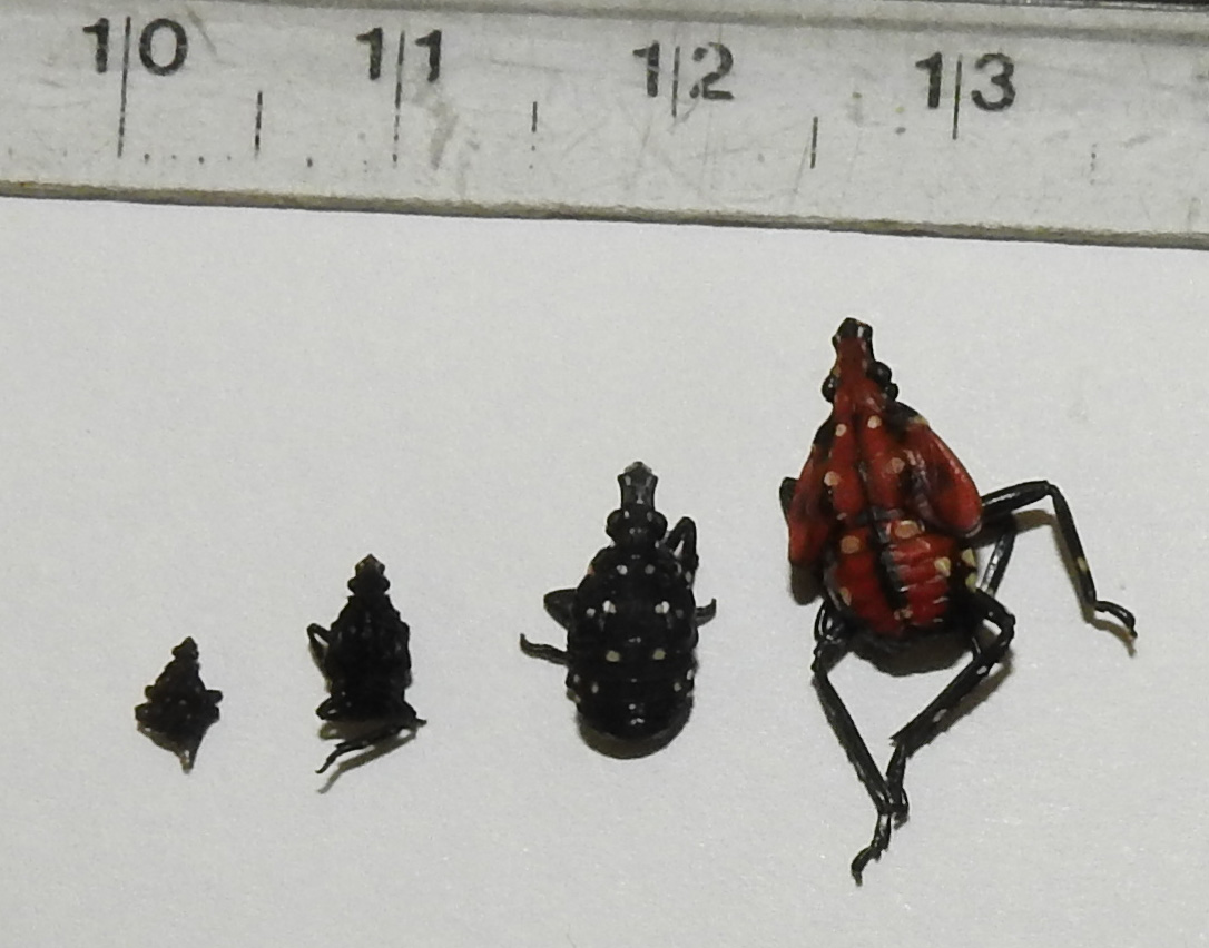 SLF in Home Fruit: Much of the information presented above also applies to home fruit production. Home fruit trees and vines are more likely to be in small groups, possibly surrounded by ornamental and shade tree, some of which can harbor high numbers of SLF. SLF may form feeding aggregations on apple and peach in the fall; these are usually short-lived, and there will probably not be severe impacts on the trees or crops. Watch for accumulations of honeydew on the fruit, and use an appropriate insecticide if needed. As in commercial settings, grape will be the most vulnerable crop. Appropriate insecticides for home use include malathion, Sevin (carbaryl), pyrethroids (such as bifenthrin, permethrin or esfenvalerate), insecticidal soap and PyGanic (pyrethrum) (Sevin should not be applied on apple for the first month after bloom unless desired as a thinner). Residual life of pyrethrum is short, so this product may be more useful in the spring if nymphs occur in high numbers, than in fall, when there is continual immigration of new individuals. See also the fact sheet on SLF management in residential areas.